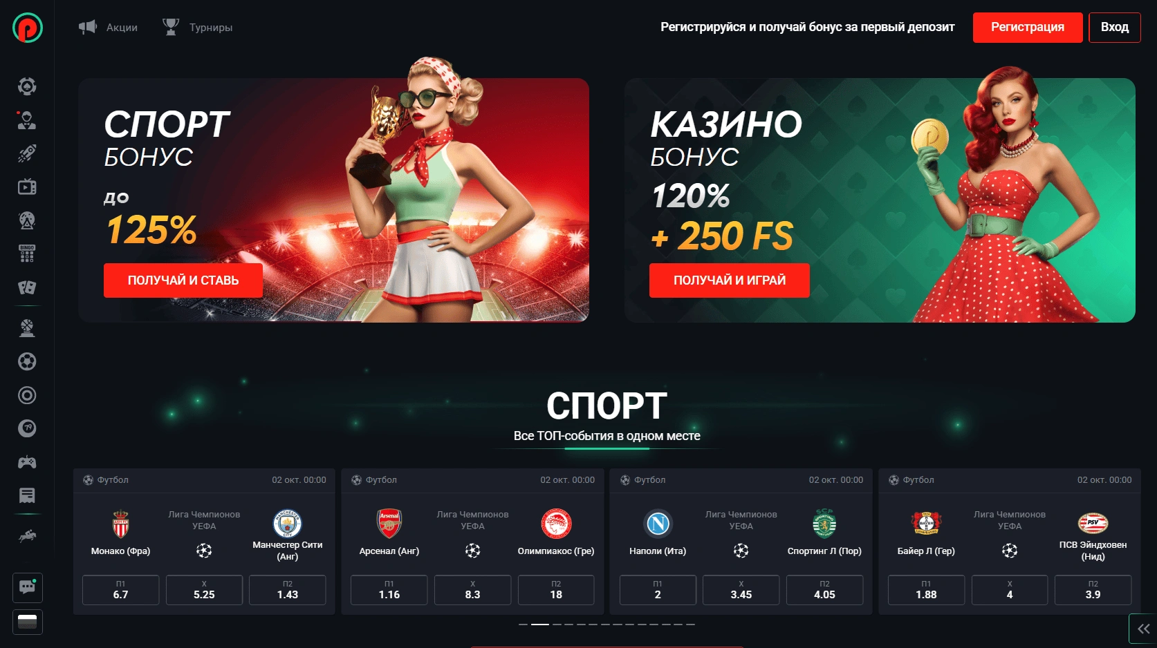 Pin Up букмекерская контора после регистрации предлагает стартовый бонус, включающий увеличение процента от первого депозита и фриспины — 120% и 250 фриспинов для слотов или 125% для ставок на спорт.